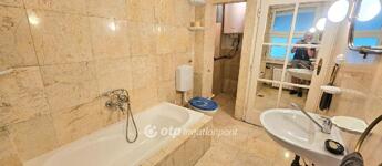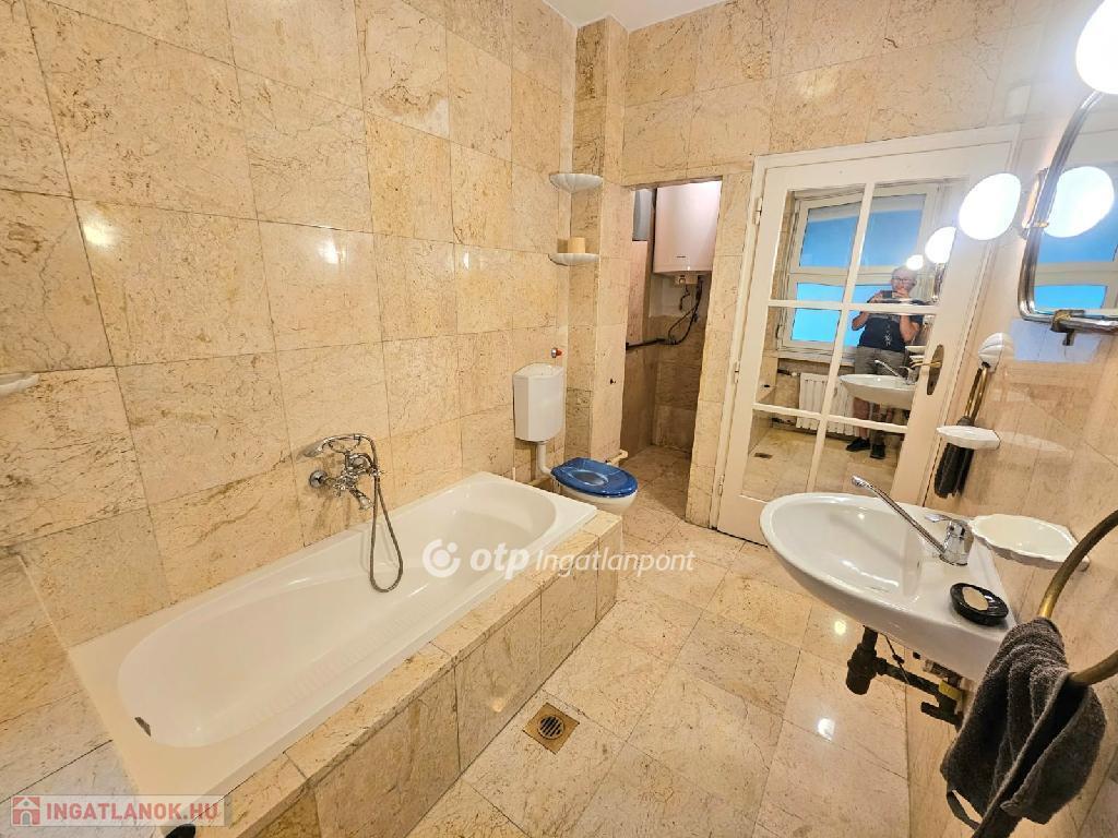 Az ablakos fürdőszoba egy nagy káddal van ellátva, innen nyílik a tehnikai helység/tároló ahova a kedvezményes tarifás távvezérelt villanyóra által ellátott elektromos vízmelegítő bojler van felszerelve. Mivel 2 külön villanyóra van így simán beleférünk a támogatott kedvezményes áram mennyiségbe. Mindkét helység a padlótól a mennyezetig szintén vastag márványlapokkal van burkolva.
