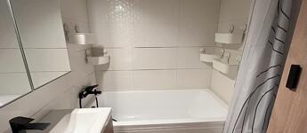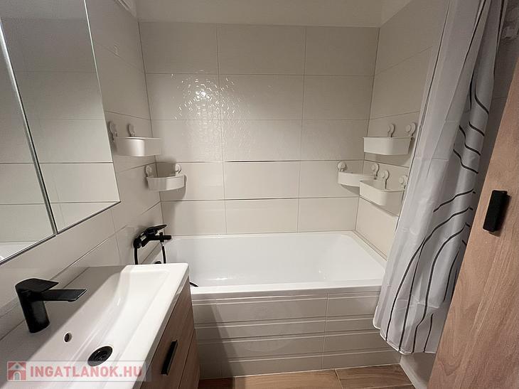 A fürdőszobában akrilkád került beépítésre, a mosógép számára a kiállás kialakításra került. A konyhába új bútorok, valamint mosogatógép kerültek be.