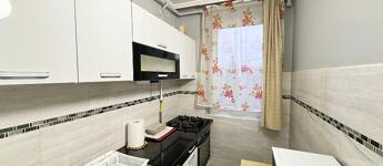 A világos, ablakos konyhába új konyhabútorok kerültek beépítésre, valamint beépített gáztűzhellyel és villanysütővel rendelkezik.