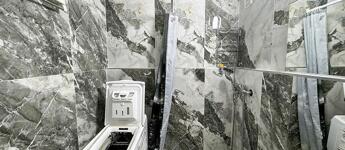 A fürdőszoba új burkolatot kapott és zuhanyzóval rendelkezik. A mosógép ebben a helyiségben kapott ki- és beállást, a WC egy külön helyiségben található.
