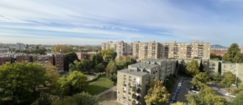 A tágas erkélyről gyönyörű kilátás nyílik a zöld parkra és a Budai-hegyekre.