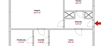 A lakás a harmadik emeleten helyezkedik el, 45 nm alapterülettel, két szobával, melyek utcai és udvari kilátással bírnak.