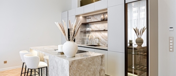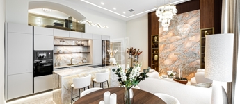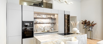 A nappali központi eleme a Scavolini konyha és a látványos médiafal, amely tökéletesen illeszkedik az otthon kifinomult stílusához.