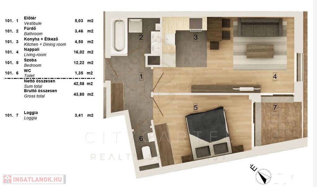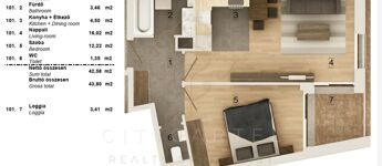 A liftes társasház 1. emeletén található, 43,8 nm-es, (42,58 nm lakás 3,41 nm loggiával) 2 szobás lakás korszerű hőszivattyús fűtés–hűtéssel és teljes körű okosotthon-rendszerrel felszerelve várja új tulajdonosát. A burkolatok még választhatók, így a leendő tulajdonos saját ízlésére szabhatja az ingatlant.