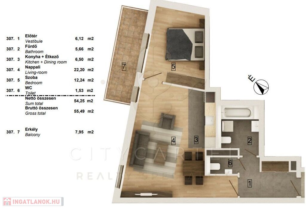 A liftes társasház 3. emeletén található, 55,49 nm-es, (54,25 nm lakás 7,95 nm terasszal) 3 szobás lakás korszerű hőszivattyús fűtés–hűtéssel és teljes körű okosotthon-rendszerrel felszerelve várja új tulajdonosát. A burkolatok még választhatók, így a leendő tulajdonos saját ízlésére szabhatja az ingatlant.