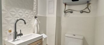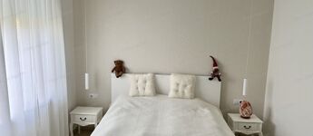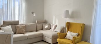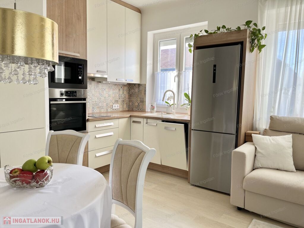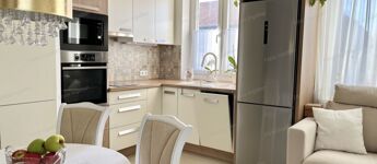 modern gépesített konyhával, ízlésesen berendezett lakás.