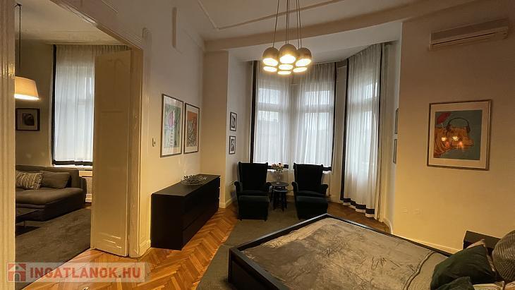 Az ingatlan központi része egy tágas, nyugati fekvésű, polgári jegyeket hangsúlyozó, praktikusan kialakított, nagy belmagasságú nappali.