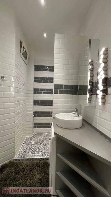 A lakásba lépve egy modern előszobába jutunk. Innen közelíthetjük meg az épített zuhannyal, mosdóval, törölközőszárítóval és mosógéppel szerelt fürdőszobát továbbá a kézmosóval is rendelkező, külön wc-t.