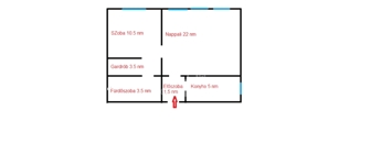 Az előtérből nyílik a 22 nm-es nappali szoba , mellette lépünk a 10.5 nm-es hálószobába. ahol helyet kapott a 3.5 nm-es gardrób helyiség.