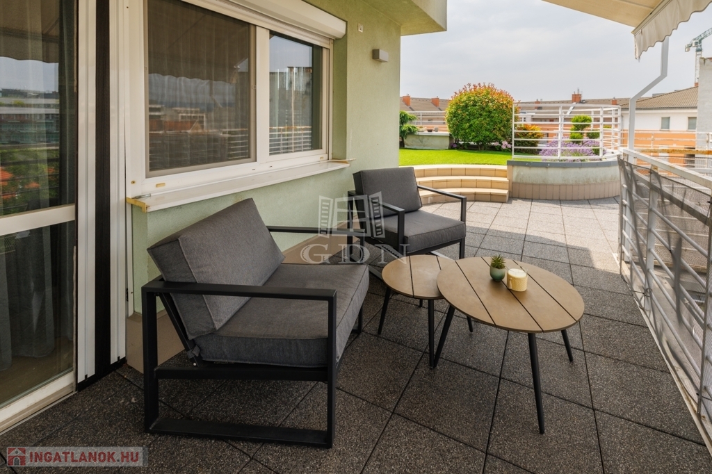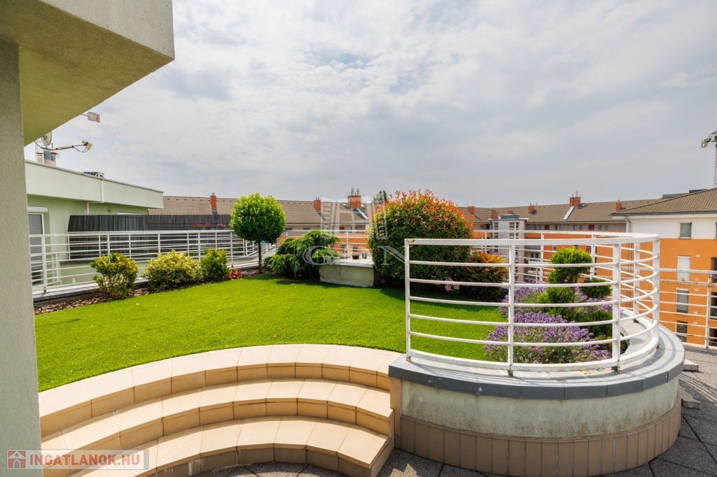A lakáshoz tartozó, 83 nm-es különleges tetőkert és terasz a kert nyugalmát és a városi élet exkluzivitását ötvözi – fűnyírás és gondozás nélkül.