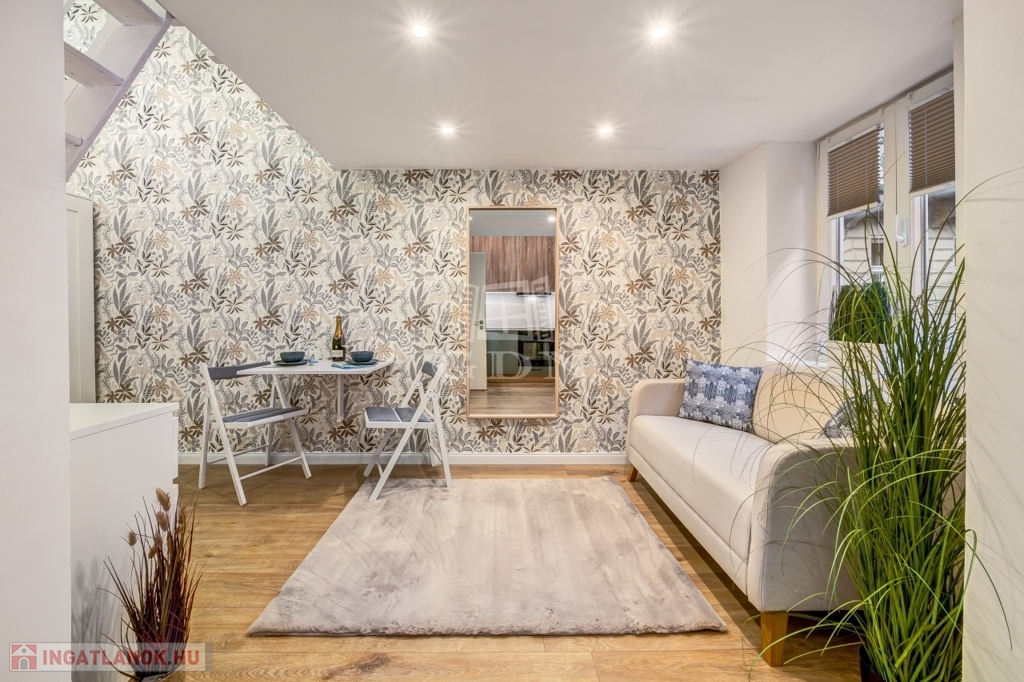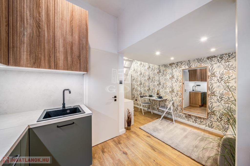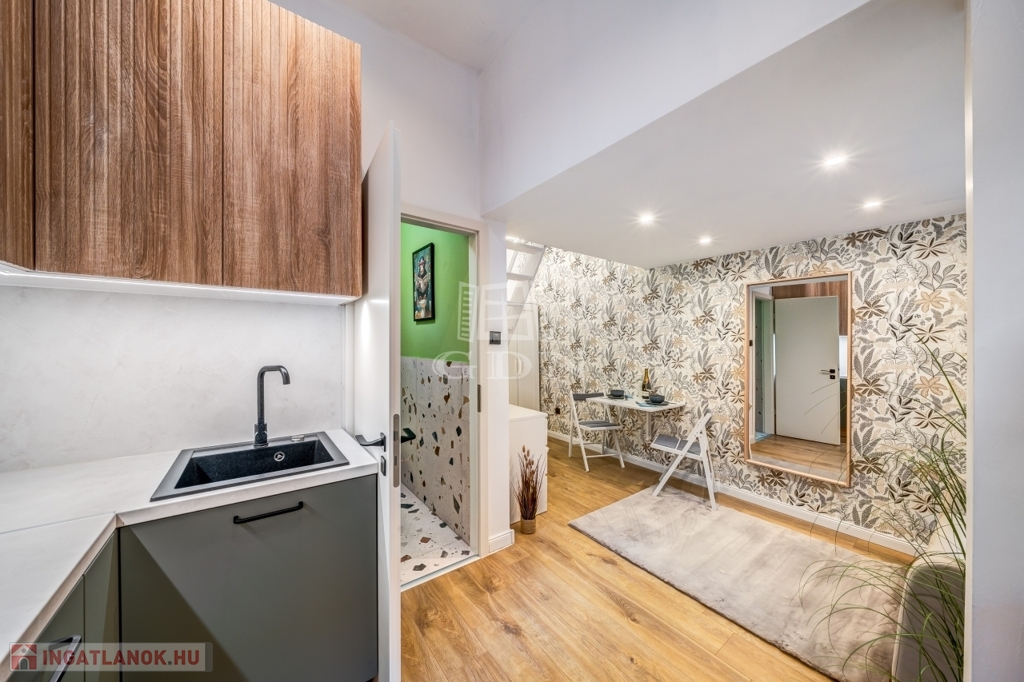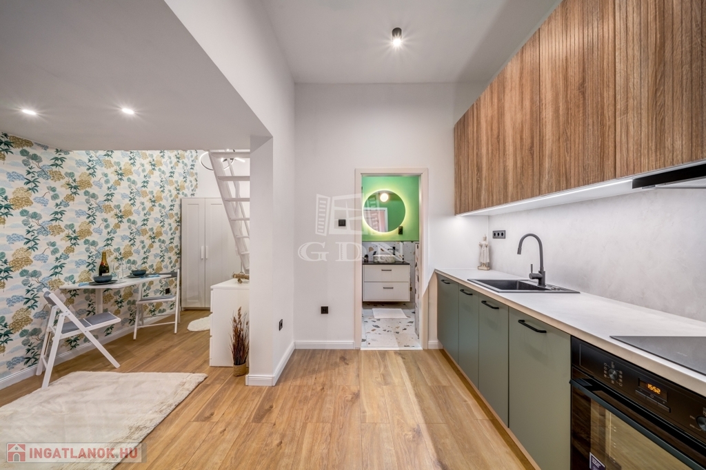 Eladó egy teljes körűen újonnan felújított, udvari nézetű, déli tájolású, 21 m²-es stúdiólakás, amelyhez 5 m² fekvőgaléria tartozik.