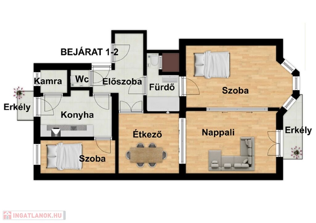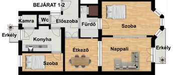 -84nm-es lakás(konyha, nappali, 2 lakószoba, fürdőszoba, előszoba, különálló wc és egy kamra)