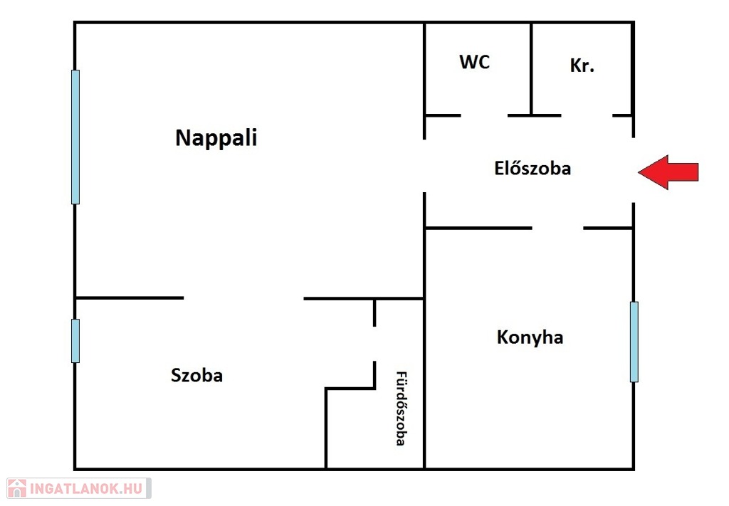 A lakásba lépve hosszúkás előszobába lépünk, melyen keresztülhaladva jutunk el a hangulatos tágas közel 17 m2 nappaliba, és innen nyílik a hálószoba, a közlekedőből balra fordulva közelíthető meg a kényelmes méretű 7,5 m2, étkezésre is alkalmas műanyag nyílászárókkal ellátott konyha. A kádas kialakítású fürdőszoba a hálószobából nyílik és 1 éve lett felújítva. A WC külön helyiségben került elhelyezésre az előszobából lehet megközelíteni, emellett rendelkezésünkre áll egy nagyon hasznos kamra is.