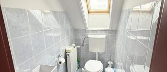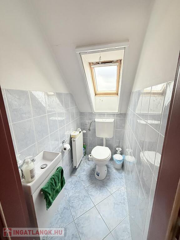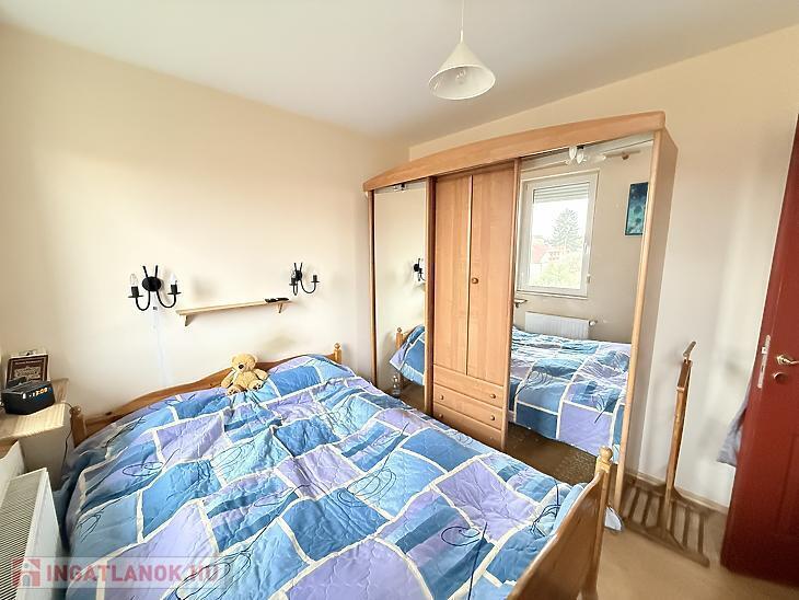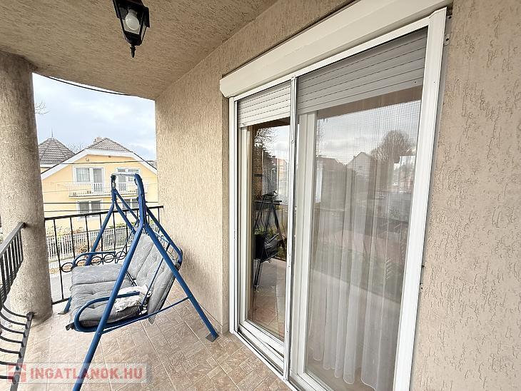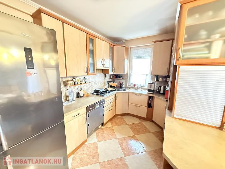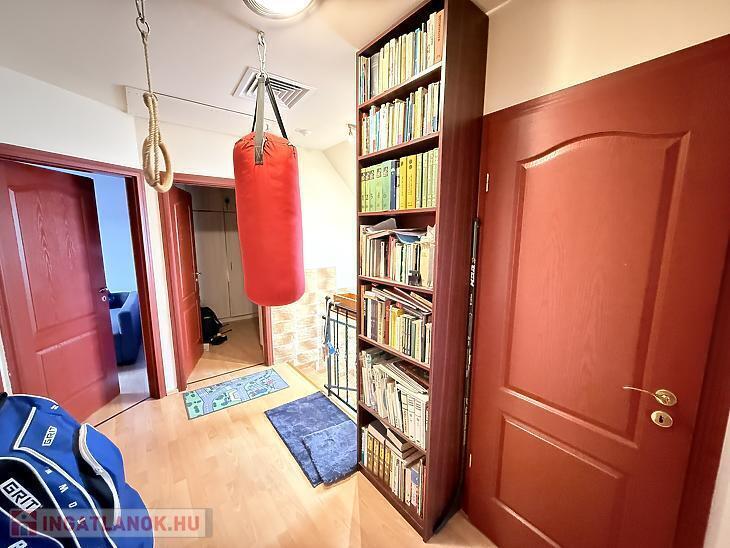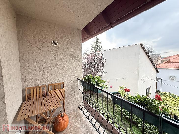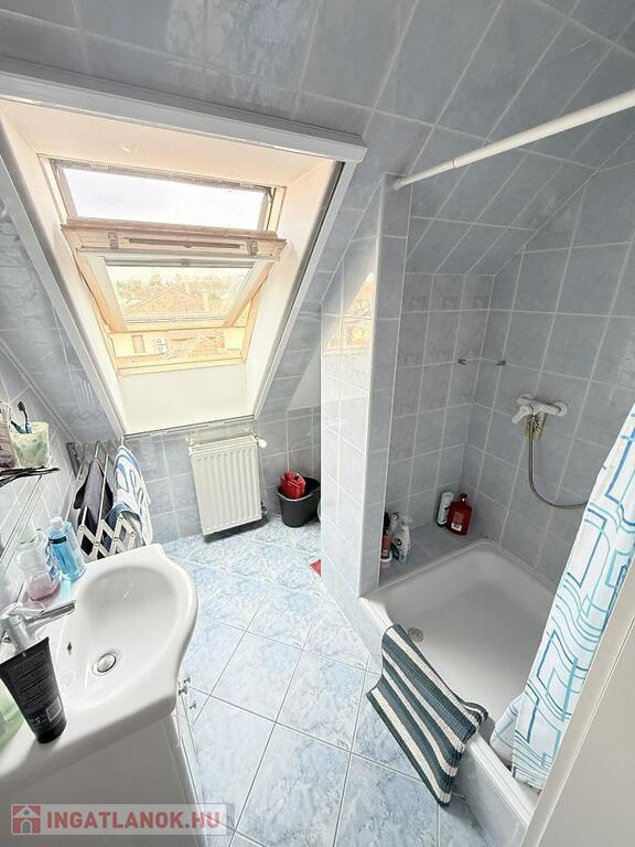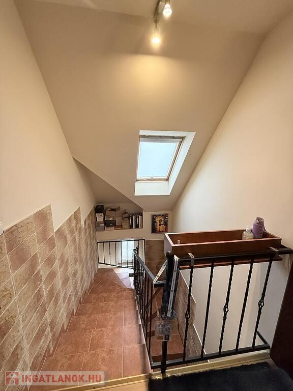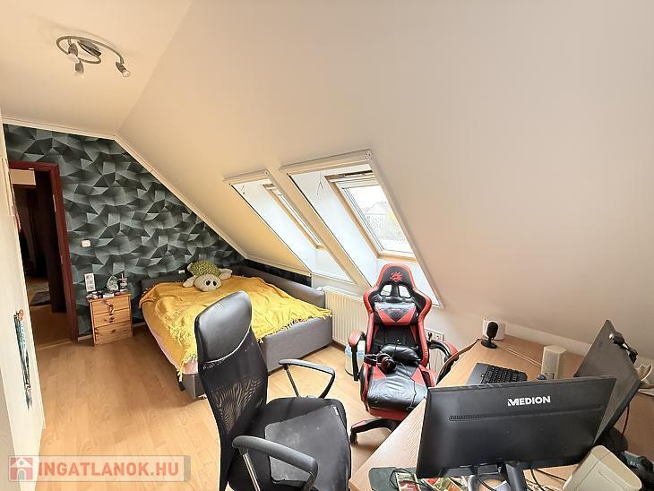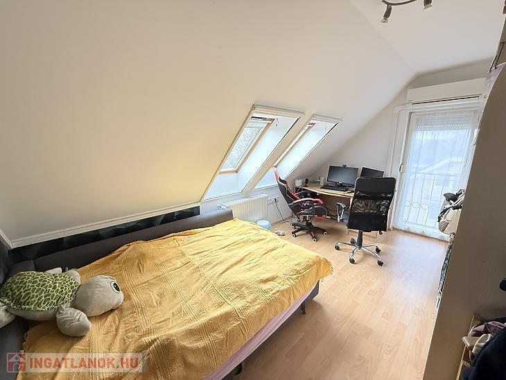 A szobák külön nyílóak, laminált burkolattal, míg a konyha és a vizes helyiségek járólaposak. A fűtésről turbós kombi cirkó gondoskodik egyedi méréssel. Az alsó szinten műanyag, a tetőtérben fa nyílászárók találhatók, redőnnyel ellátva. A lakás duplakomfortos: az alsó szinten kádas fürdőszoba, míg az emeleten zuhanyzós fürdőszoba és külön mellékhelyiség került kialakításra. A 6 m²-es erkély a nappaliból közvetlenül megközelíthető, kellemes kültéri életteret biztosít. A beépített bútorok a vételár részét képezik.
