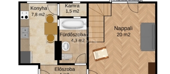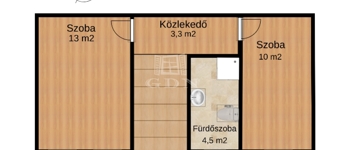 - Földszint: konyha, kamra, fürdőszoba, tágas nappali