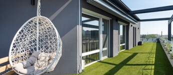 XXI. Csepel belvárosában eladásra kínálok Új építésű - 94 nm-es, belső kétszintes, 104 nm-es műfüves félköríves terasszal, körpanorámás ,egyedi kialakítású Penthouse lakást.