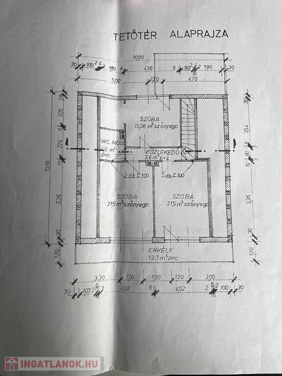 Tetőtér: 3 szoba, zuhanyzós fürdőszoba + mellékhelyiség, erkély.