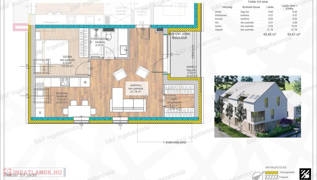 A lakás alapterülete 55,61 m2, egy tágas szobával, hatalmas amerikai konyhás nappalival és erkéllyel is rendelkezik.