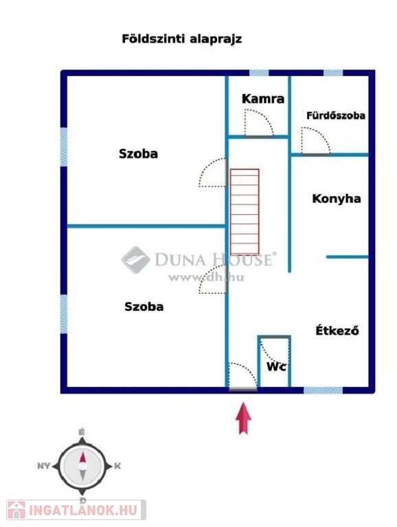 A földszinten 2 nagy méretű szoba, konyha, étkező, kamra, fürdőszoba és külön wc helyiség van.