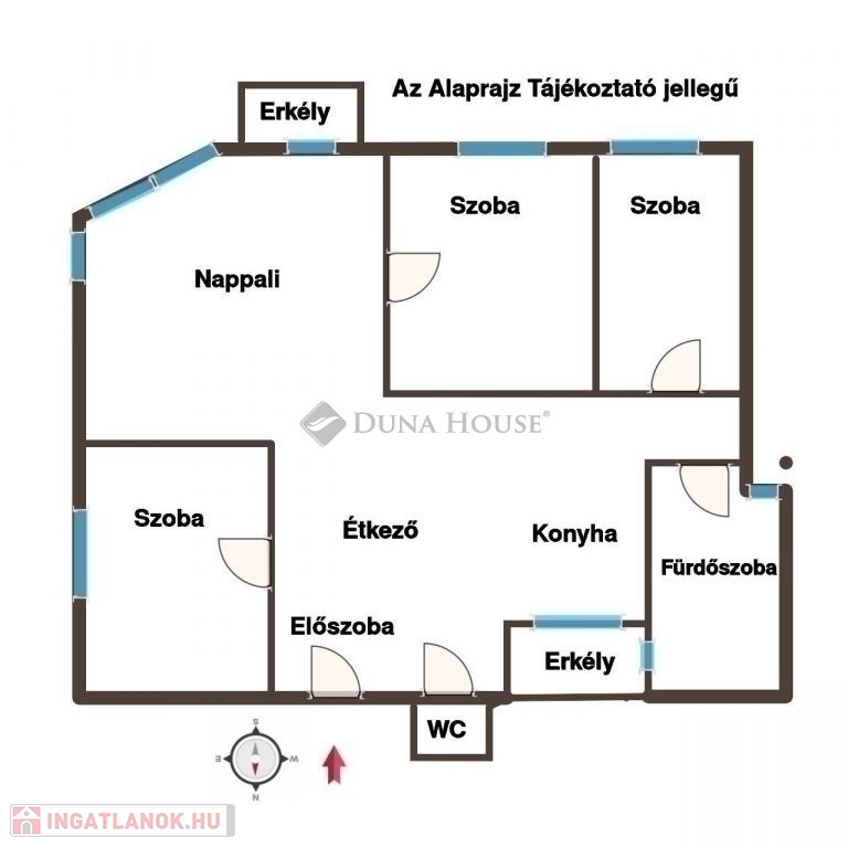 Hatalmas konyha-étkező, világos nappali, három hálószoba, fürdőszoba WC-vel, külön WC kézmosóval, két erkély.