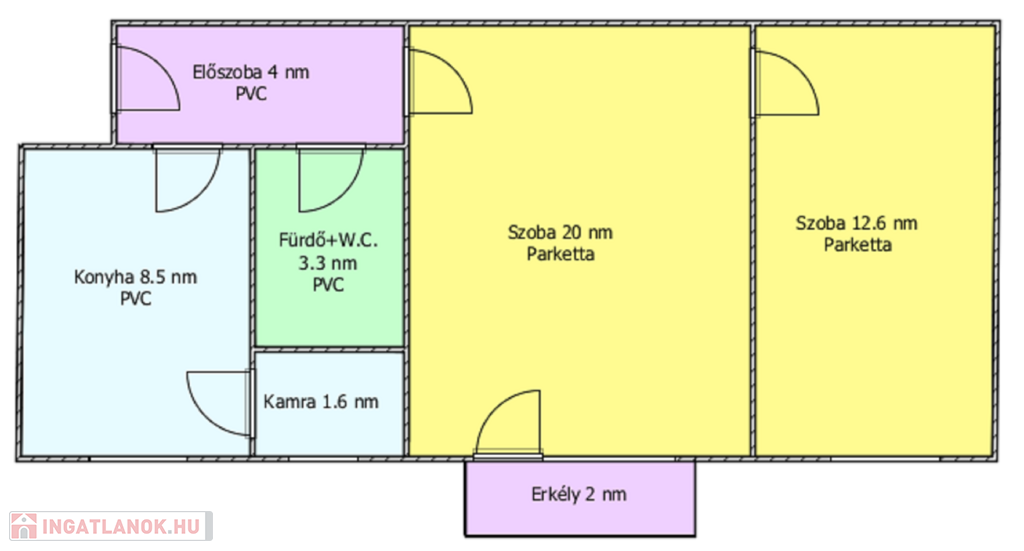 Helyiségei: 2 szoba, konyha, kamra, előszoba, fürdőszoba, erkély.