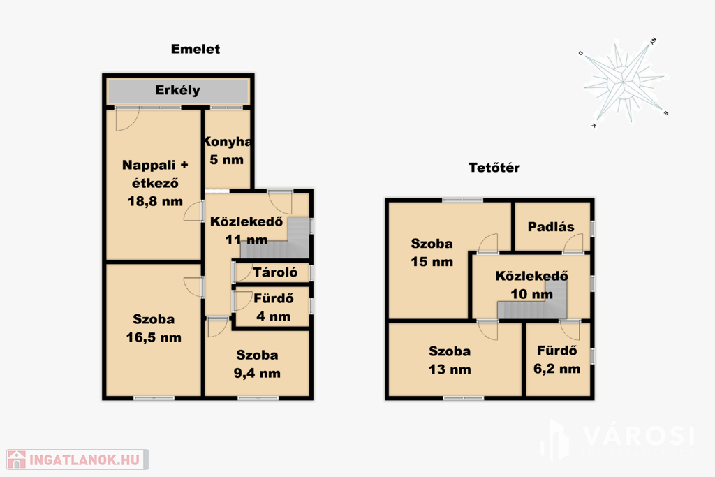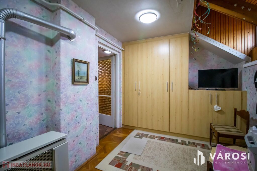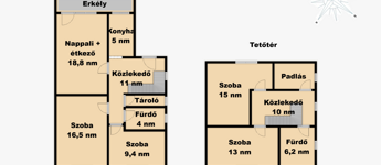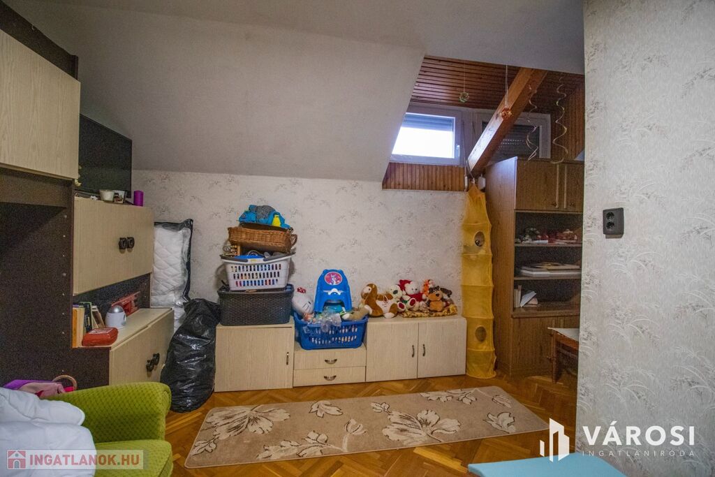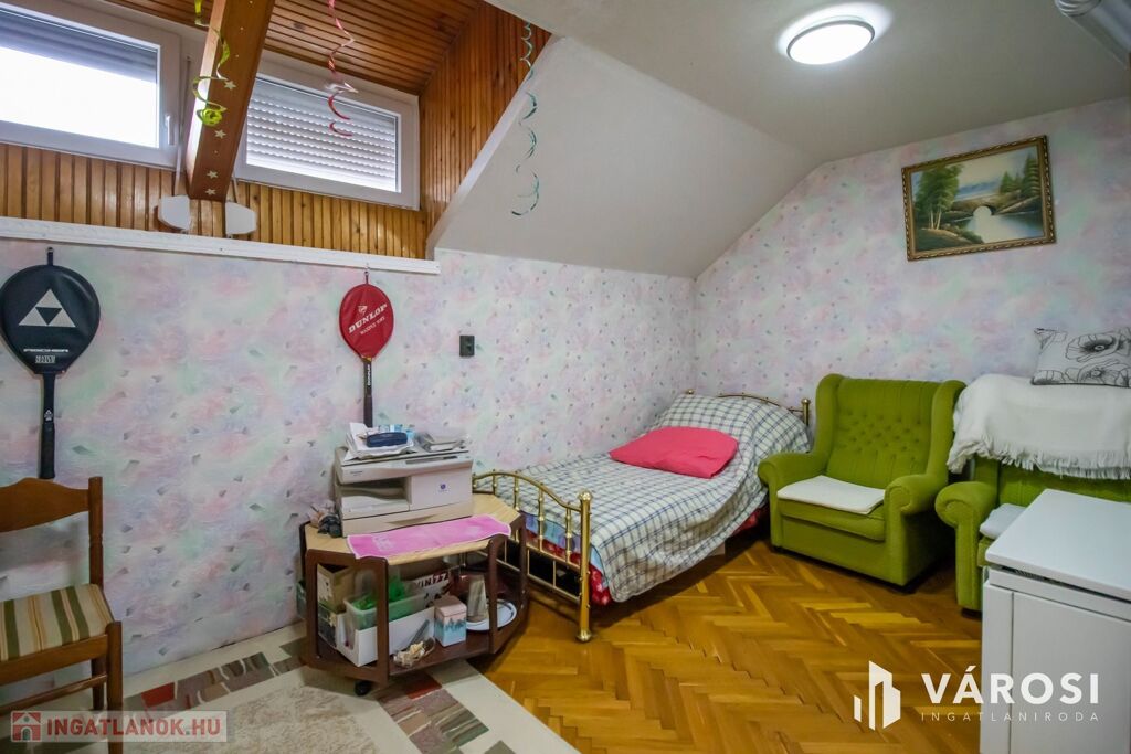 A felső szinten 2 darab nagy méretű szoba található, valamint tágas kádas fürdőszoba WC-vel, 43 négyzetméteren. Innen közelíthető meg a tárolásra alkalmas kis padlástér is.