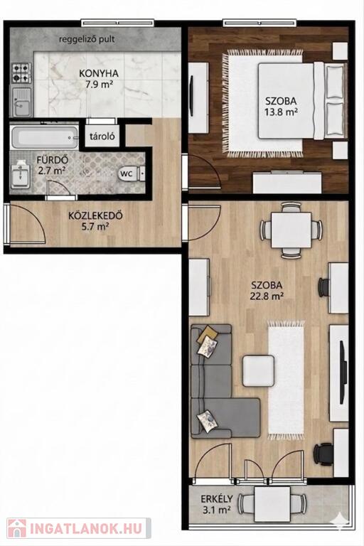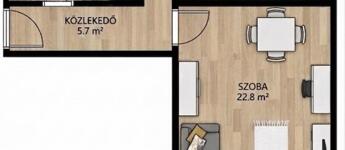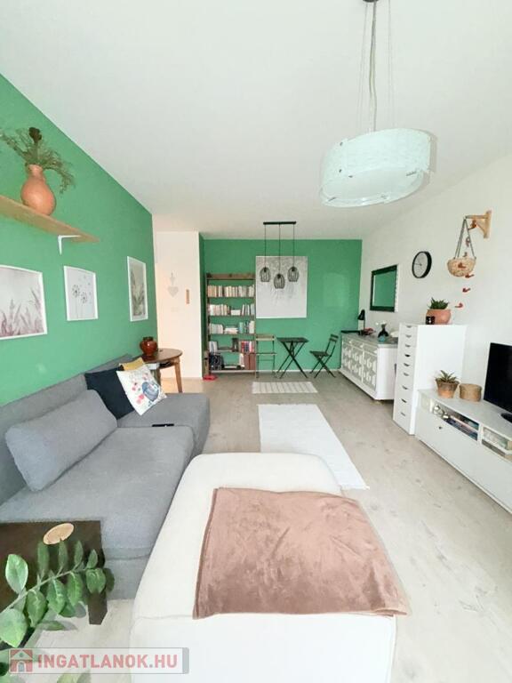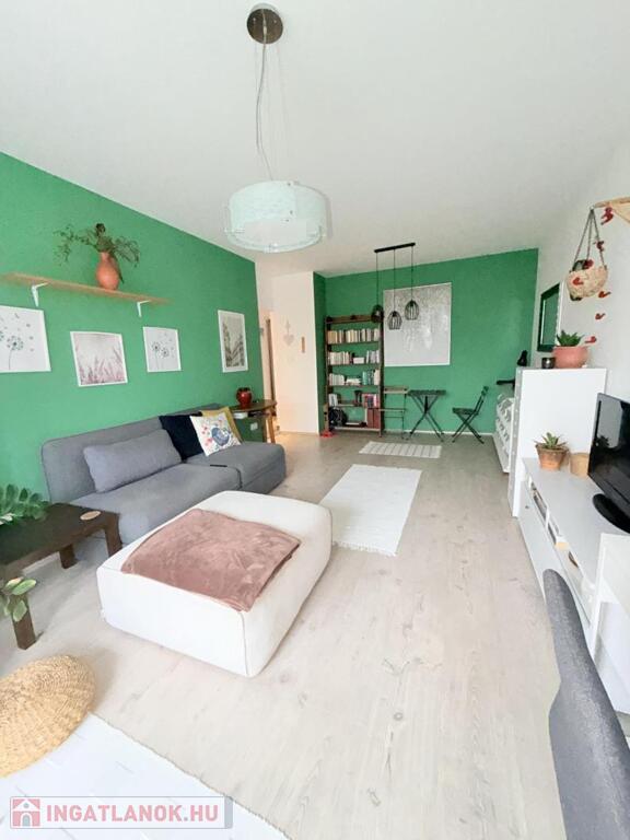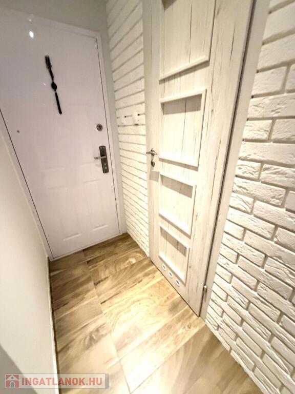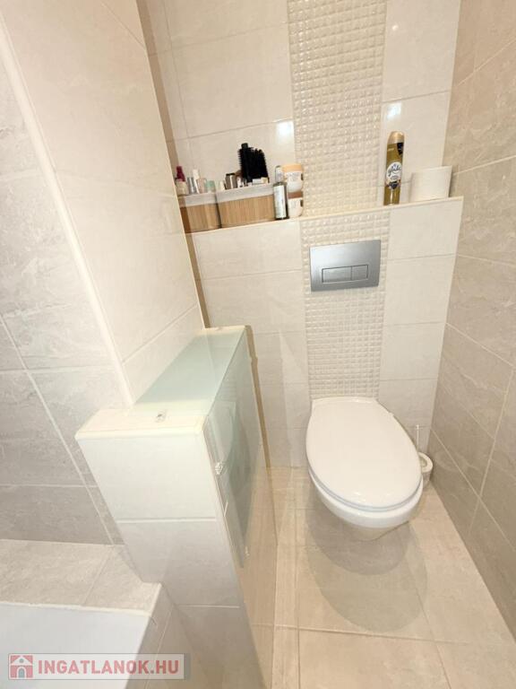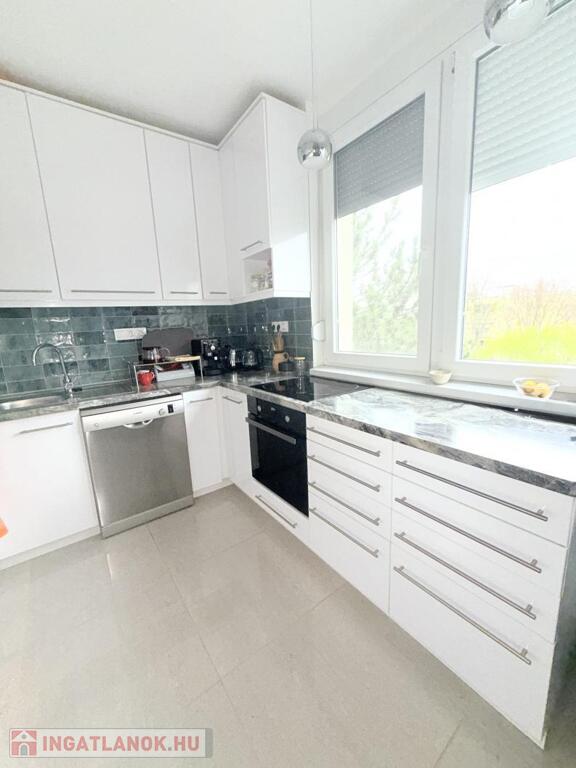 A konyhabútor egyedi stílusban,gépészettel felszerelt . A nappali , előszoba és igényes fürdőszobában színben és stílusban passzoló burkolatokkal .A hálószobában egy praktikus,szó szerint mindent elnyelő beépített gardrób szekrénnyel.