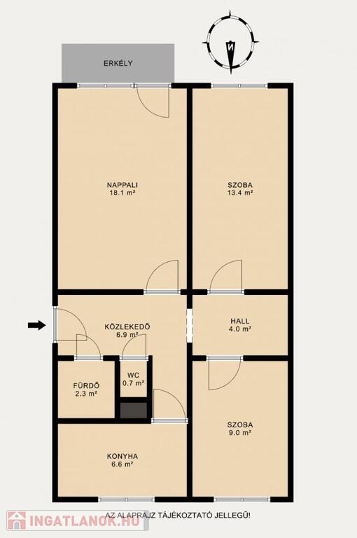 • Lakótér: A lakás területe 63 m², melyen 2 + 1 félszoba, konyha, fürdőszoba, WC, előszoba és erkély található.
