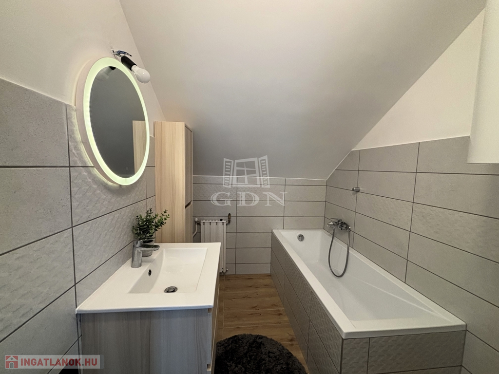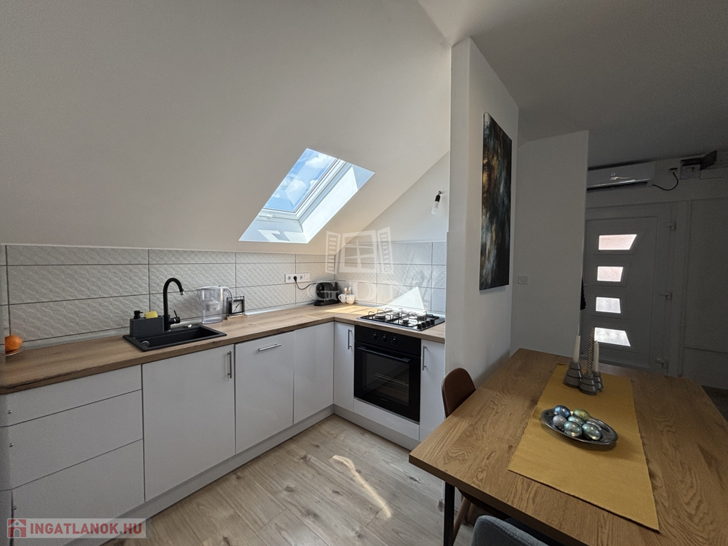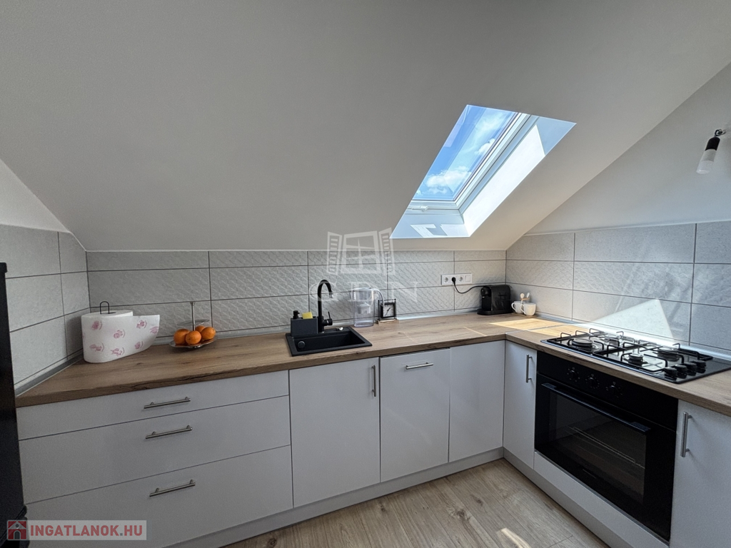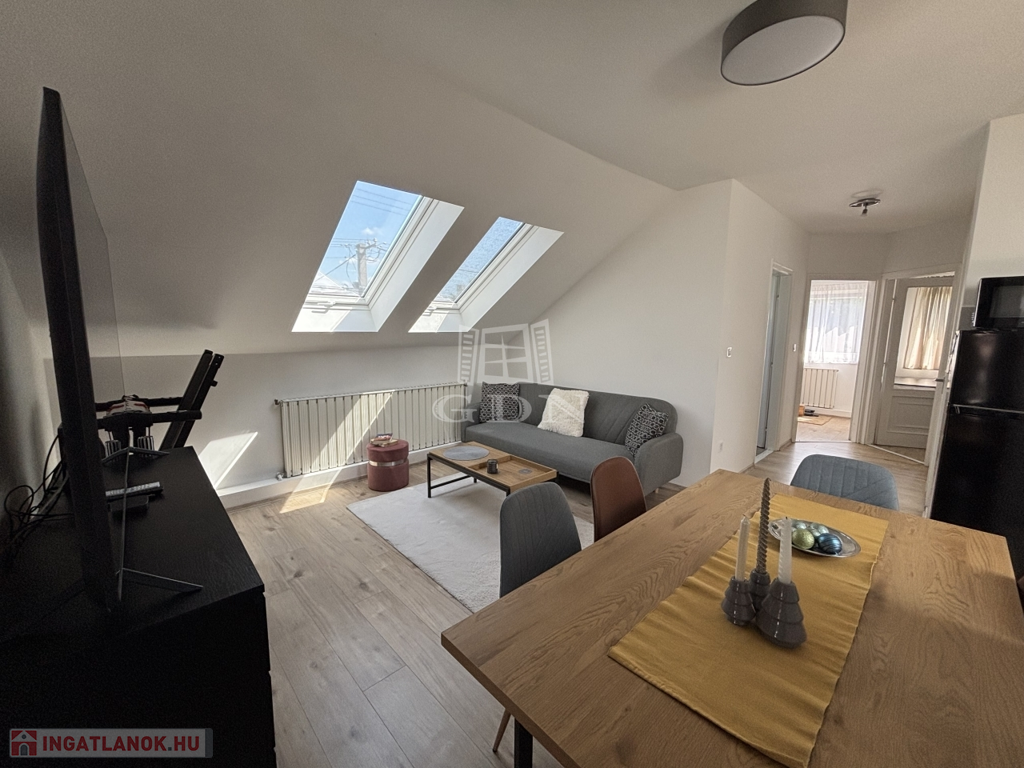 Eladó egy 65 m² alapterületű, AMERIKAI KONYHÁS nappalis, három szobás, teljes körűen FELÚJÍTOTT tetőtéri lakást, melyhez 75 m²-es SAJÁT KERT tartozik.