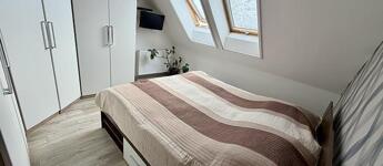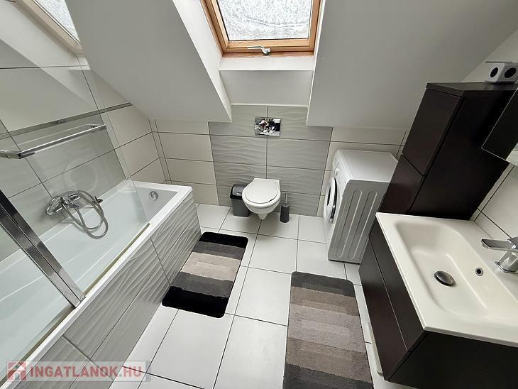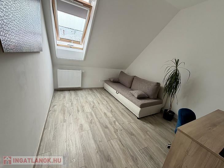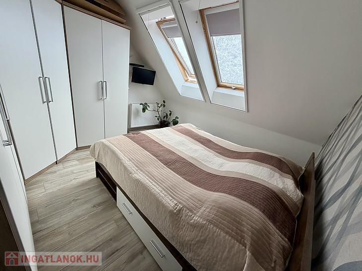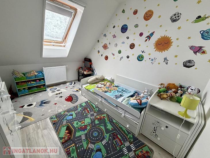Az emeleti szinten három külön nyíló szoba, egy WC-vel ellátott fürdőszoba, valamint egy padlástér található, amely kiválóan alkalmas tárolásra. A lakás műanyag nyílászárókkal rendelkezik, minden ablak redőnnyel és szúnyoghálóval felszerelt, a fűtést kondenzációs gázkazán biztosítja, emellett padlófűtés és két darab hűtő-fűtő klíma gondoskodik a komfortérzetről mindkét szinten. Az épület kiváló hang- és hőszigeteléssel rendelkezik (Silka falazat, 12 cm szigetelés), a lakáshoz pedig saját parkolóhely is tartozik. A vételár részét képezik a szülői hálószobába egyedileg tervezett gardróbszekrény, valamint a teljes gépesítéssel ellátott konyhabútor és a fürdőszobabútorok is.