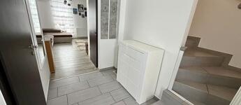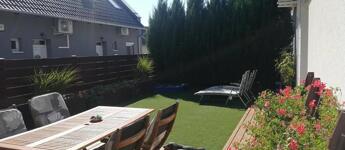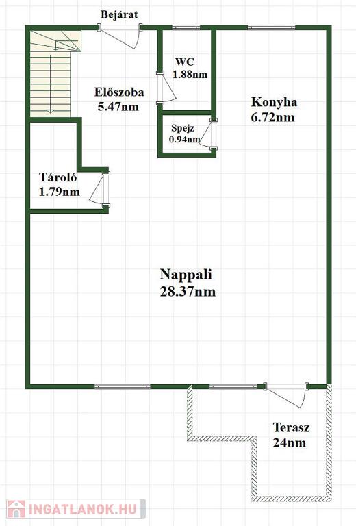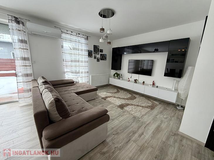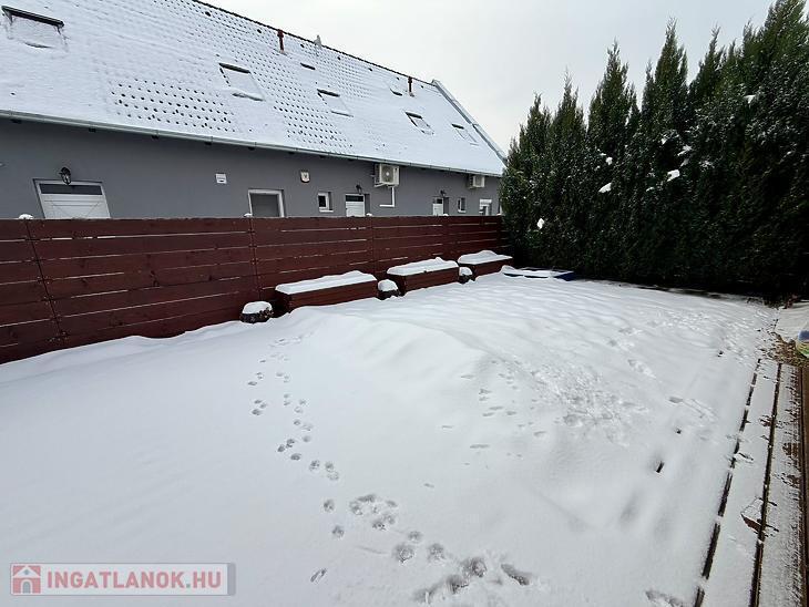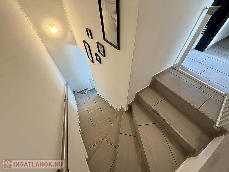 Az ingatlan remek elosztású: az alsó szinten egy tágas előszoba fogad, innen nyílik az amerikai konyhás nappali, két praktikus kamra, valamint egy vendég WC. A nappaliból közvetlen kijárat vezet a 70 nm-es, privát, elkerített kertbe, ahol egy gondosan kialakított, terasz biztosít ideális helyszínt pihenéshez vagy baráti összejövetelekhez.