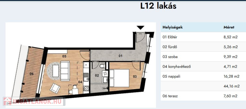 - 44,16 négyzetméter, alacsony energiaigényű, 7,6 négyzetméteres terasszal