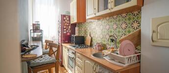 Konyhabútor beépített gépekkel, hűtő, IKEA franciaágy, bőr ülőgarnitúra, olvasófotel, íróasztal, polcok, csillárok és szalagfüggönyök, gardróbszekrény – mindez praktikusan elrendezve, harmonikus térben.