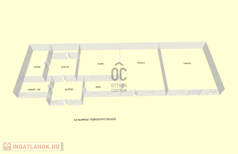 Elosztása: előszoba, két tágas szoba, konyha, kamra, fürdőszoba+wc és közlekedő.