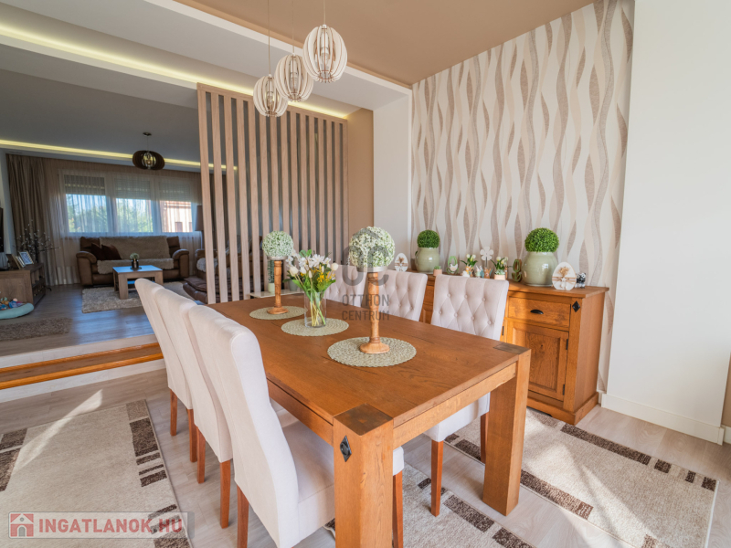 - konyha- étkező ( közvetlen terasz kapcsolattal) és nappali egy légtérben került kialakításra a földszinten, ahol még fürdőszoba, kölön WC, kamra és előszoba található
