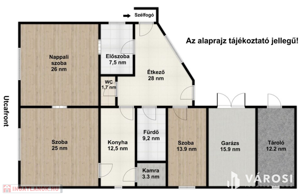 Az udvarról egy szélfogón keresztül jutunk be az étkező-nappaliba, innen nyílnak a további helyiségek: a konyha, egy szoba, a fürdő, a külön WC,. Innen juthatunk be a gardróbos előszobába, ahonnan pedig az utcafronti, egymásba nyíló szobákba.