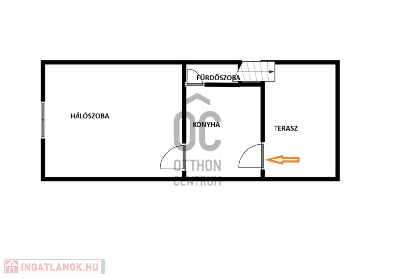 - a földszinten: szoba, konyha, fürdőszoba, terasz