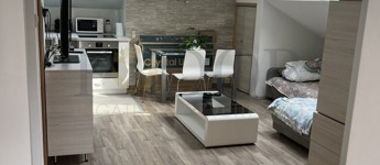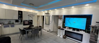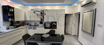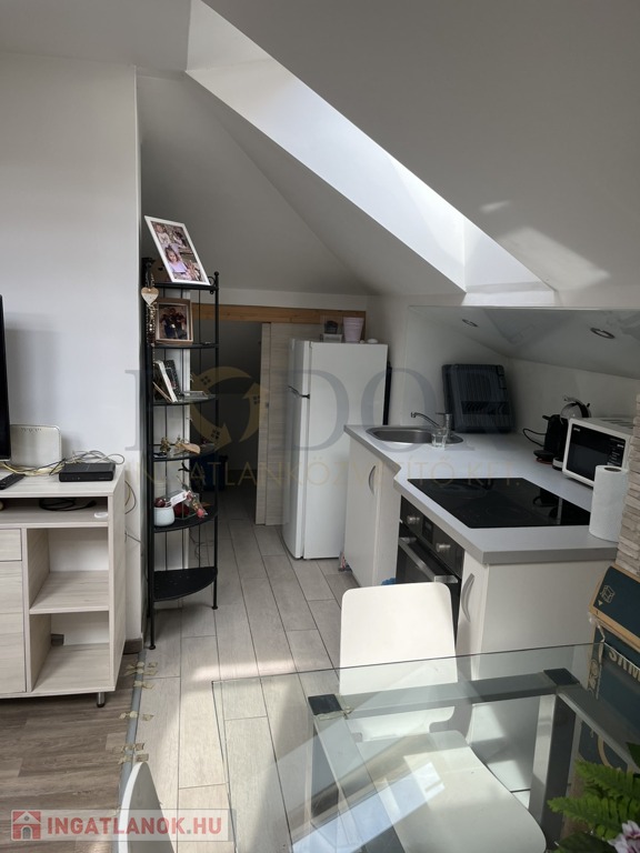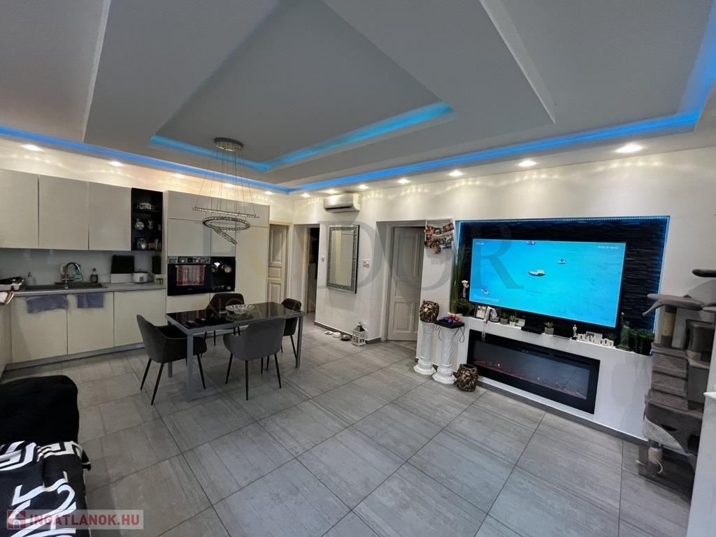 A modern, gépesített konyha beépített berendezésekkel felszerelt. A helyiségek burkolata járólap és laminált padló, a nappali és az egyik hálószoba klimatizált.