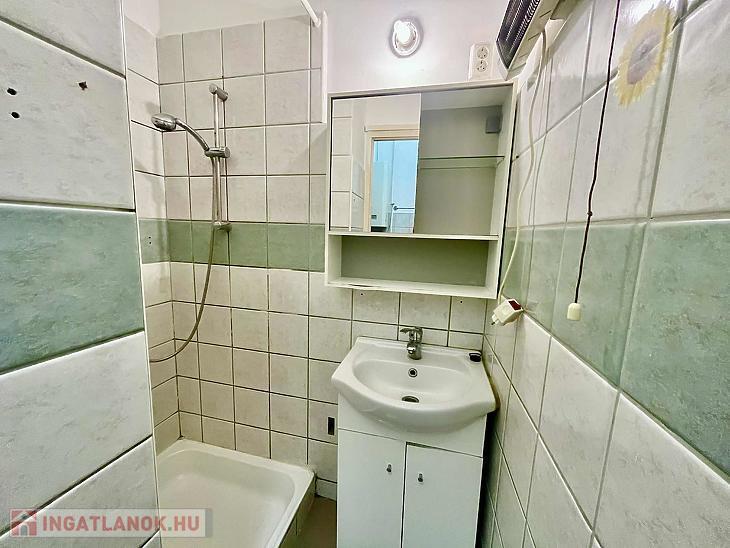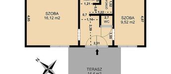A telek végében elhelyezkedő, különálló házban balra és jobbra található egy-egy világos, DNy-i irányba, kertre tekintő szoba. Az előtérből egyenesen juthatunk a főzőfülkéhez, a zuhanyzós fürdőhöz és egy külön leválasztott wc-hez. A tető cseréppel fedett, fafödémes. A szobák fűtését gázkonvektor biztosítja. A bejárat előtt egy 14 m2-es burkolt terasz található.