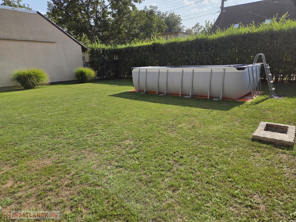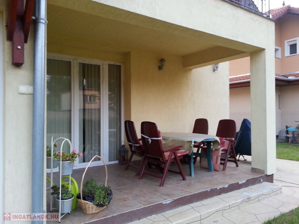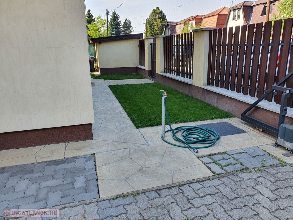 Az 550m2 es kert rendezett, 3 autó számára autóbeállóval / 1 fedett /, távirányítású kapuval, kerti és mozgásérzékelős világítással, kerti csappal, fúrt kúttal, kerti sütővel valamint 5m2 es zárható tároló épülettel.