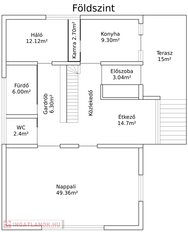 15 m²-es terasz, ahonnan lépcső vezet közvetlenül a kertbe és a medencéhez.