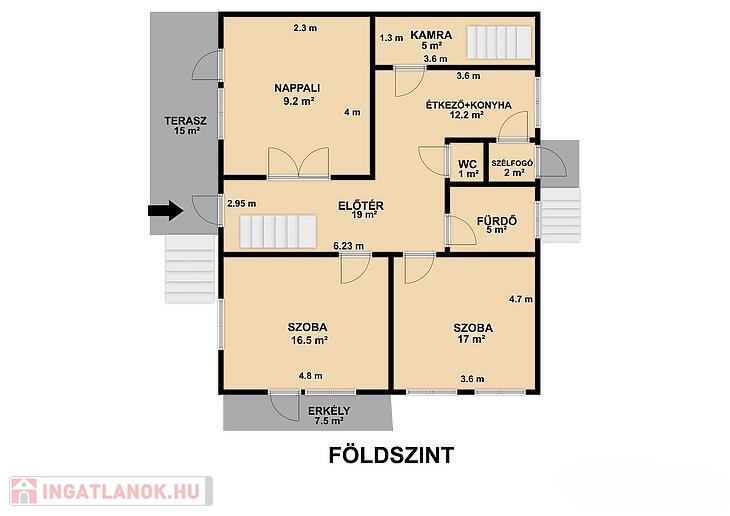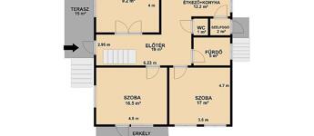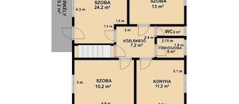 Földszint: 3 szoba, étkező + konyha, fürdőszoba, mellékhelyiség, előtér.