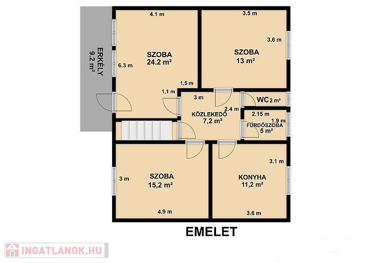 Emelet: 4 szoba, fürdőszoba, mellékhelyiség.