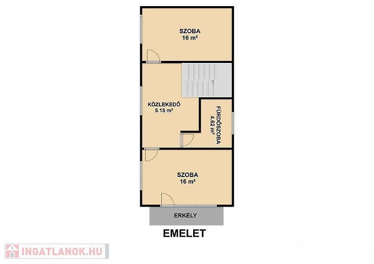 Emelet: 2 szoba, fürdőszoba, közlekedő.