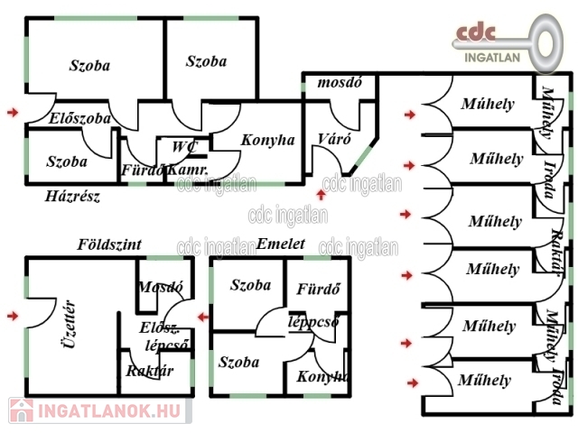 Felosztását tekintve egy 150 m2-es, 2 szintes családi ház, lent üzlettel, fent 2 szobás, konyhás, cirkó fűtéses, klimatizált lakással. Tartozik hozzá egy 101 m2-es, 3 külön nyíló szobás, ablakos konyhás, cirkó- és padló fűtéses, hűtő-fűtő klímás, tégla építésű, részlegesen felújított házrész ÚJ NYÍLÁSZÁRÓKKAL és pincével. A 6 állásos műhelyben van szerelő aknás, küszöbemelős beállóval, kéziműhellyel, raktárral, ügyfél váróval, irodával, mosdóval, 3 fázisú árammal, 230/400V, ev relékkel, cirkó fűtéssel, (kondenzációs kazán radiátorokkal) és 3,5 KW hűtő-fűtő klíma, motoros szekcionált garázsapu, levegőrendszer kiépített végpontokkal, aknában kompresszor telepítési hellyel, riasztóval, udvar térkövezve, kapu elektromos toló, távvezérlős, igény esetén tovább vihető gépjárműjavító telephelyengedéllyel rendelkezik.