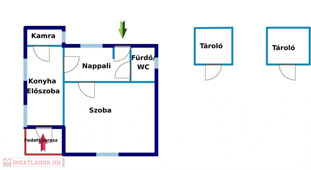 A ház háta mögött több tároló is található. A kert egy része le lett választva, ahol jelenleg kisállat tartás folyik - többi részen pedig növénytermesztésre is alkalmas földterület van.