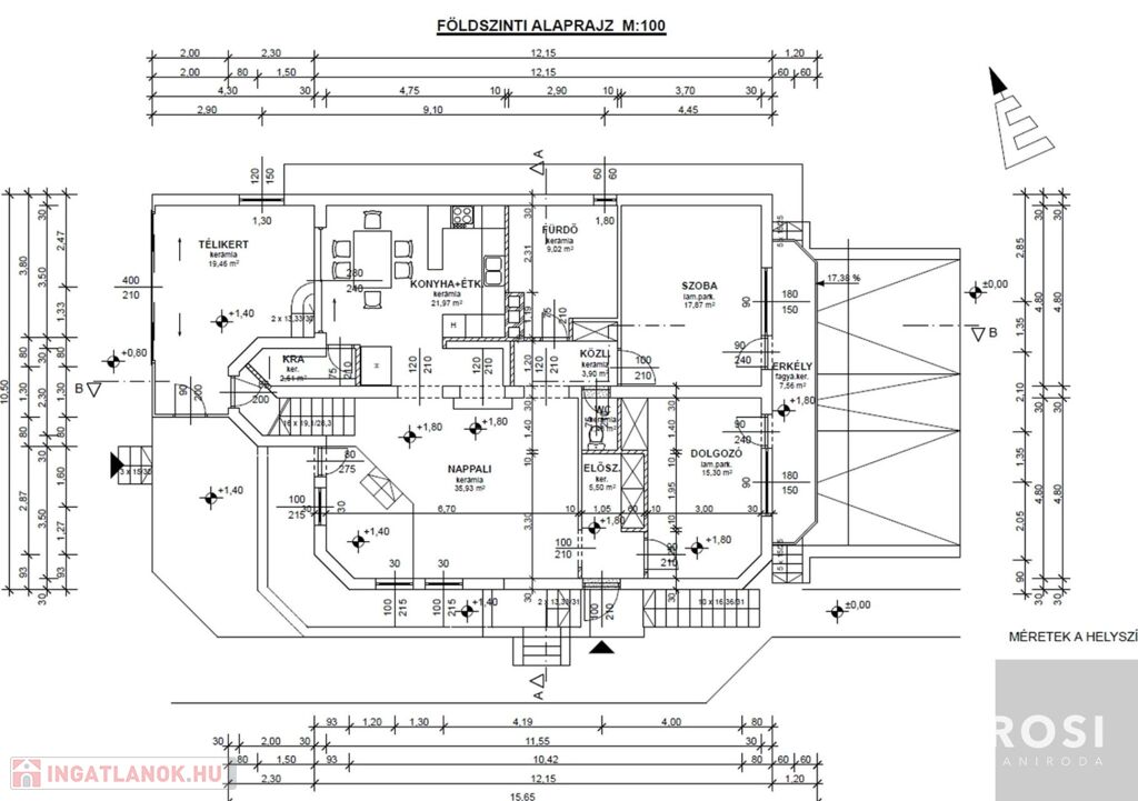 Földszint (136,5 m²) – világos nappali, étkező-konyha, 2 szoba, mosdó, kialakítandó fürdőszoba, és egy közel 20 m2-es télikert