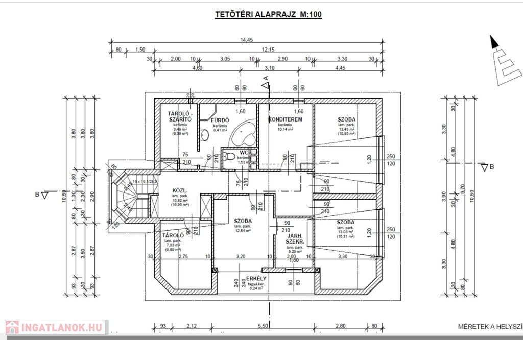Tetőtér (nettó 94,9 m²) – 4 szoba, melyből egy konditeremnek van berendezve, fürdőszoba, külön Wc, gardrób és tárolók