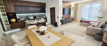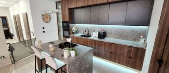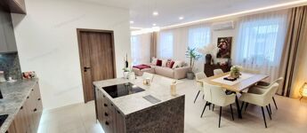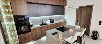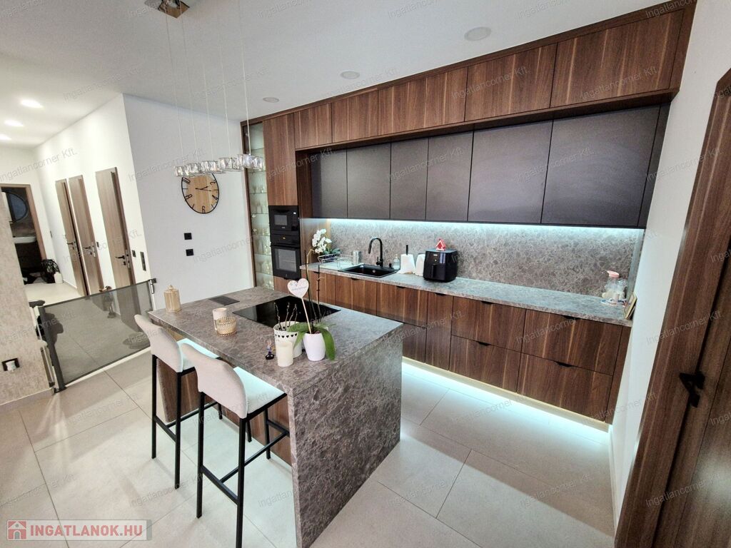 A modern konyhát egy FUNKCIÓNÁLIS KONYHASZIGET egészíti ki, amelybe beépített hosszabbító, valamint egy ELECTROLUX indukciós főzőlap került elhelyezésre, számtalan plusz tárolóval, így a mindennapi használat és a főzés egyaránt kényelmes és hatékony. További beépített konyhagépek: WHIRLPOOL 12 terítékes beépített mosogatógép, toronyba épített, ELECTROLUX légkeveréses sütő, SAMSUNG beépített mikrohullám sütővel.