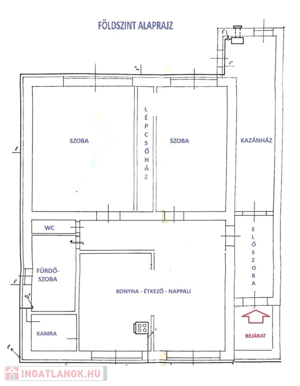 - Földszint : előszoba, amerikai konyhás nappali, 2 szoba, kamra, fürdőszoba, WC, lépcsőház, kazánház
